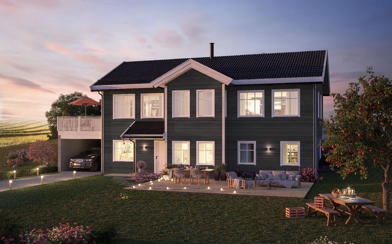 Herøyfjord er en romslig og familievennlig sokkelbolig med carport. Alle soverom er lagt i sokkeletasjen, hvor du også har inngangen. Hovedsoverommet har en stor garderobeløsning og eget bad. Herøyfjord fås både med valmtak og saltak.