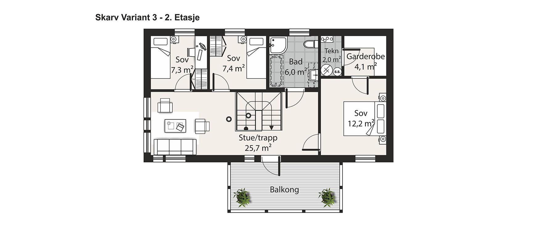 VARIANT 2 - Skarv med flatt tak gir deg en fl eksibel bolig med et moderne og spenstig utseende. Alle soverom plassert i andre etasje gir deg gode oppholdsrom til hele familien.